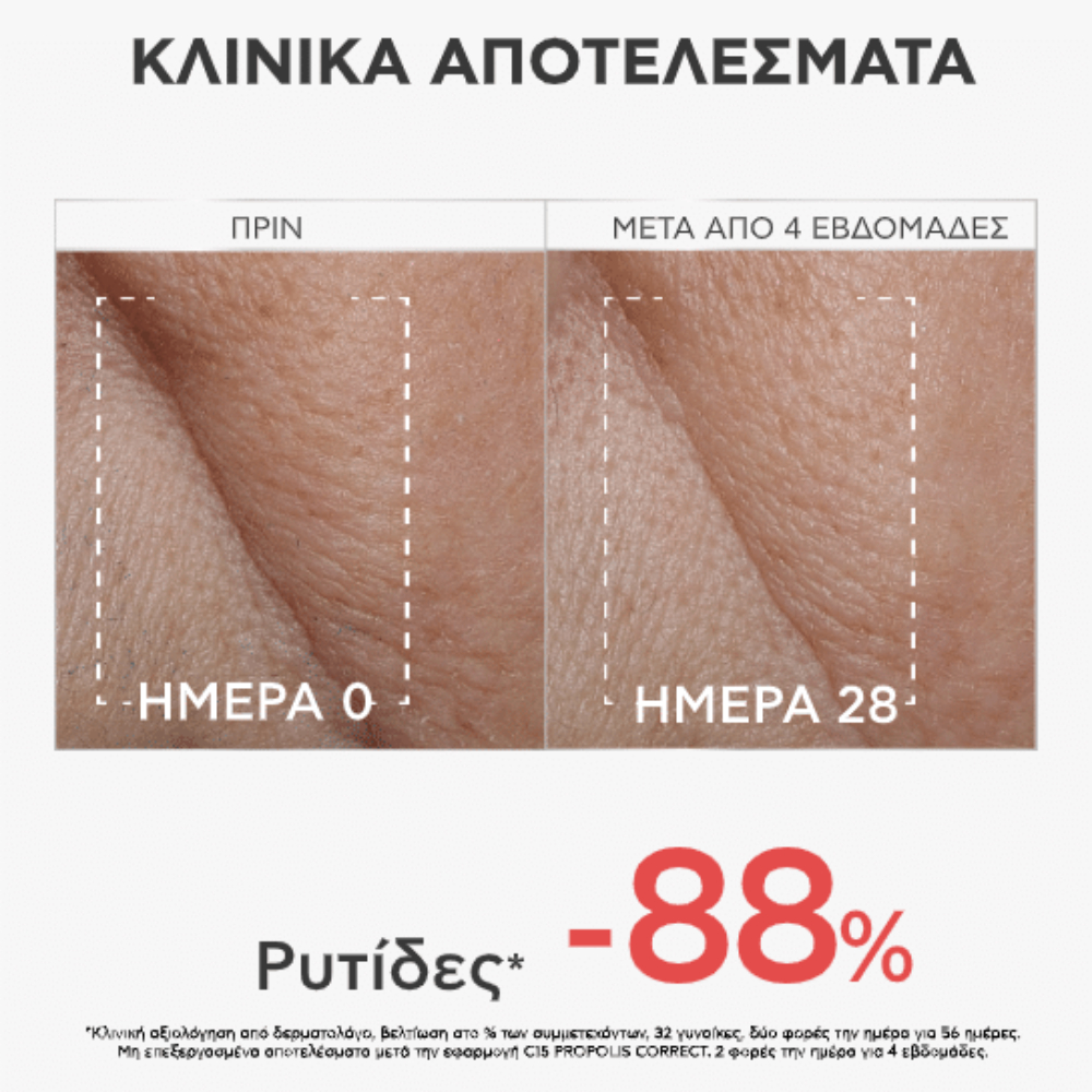 O ΟΡΟΣ C15 PROPOLIS CORRECT αποτελεί έναν ισχυρό συνδυασμό αντιγήρανσης με βιταμίνες C & E και Πατενταρισμένη propolis AoX-CR.